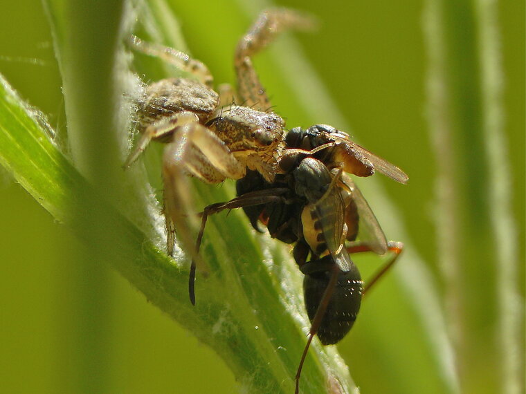 Toutes petites mouches qui sont reconnues pour se nourrir au dépend de proies capturées par d’autres espèces ; vraisemblablement une fourmi sur cette photographie, capturée par une araignée crabe (une thomisidée). On parle de cleptoparasitisme.