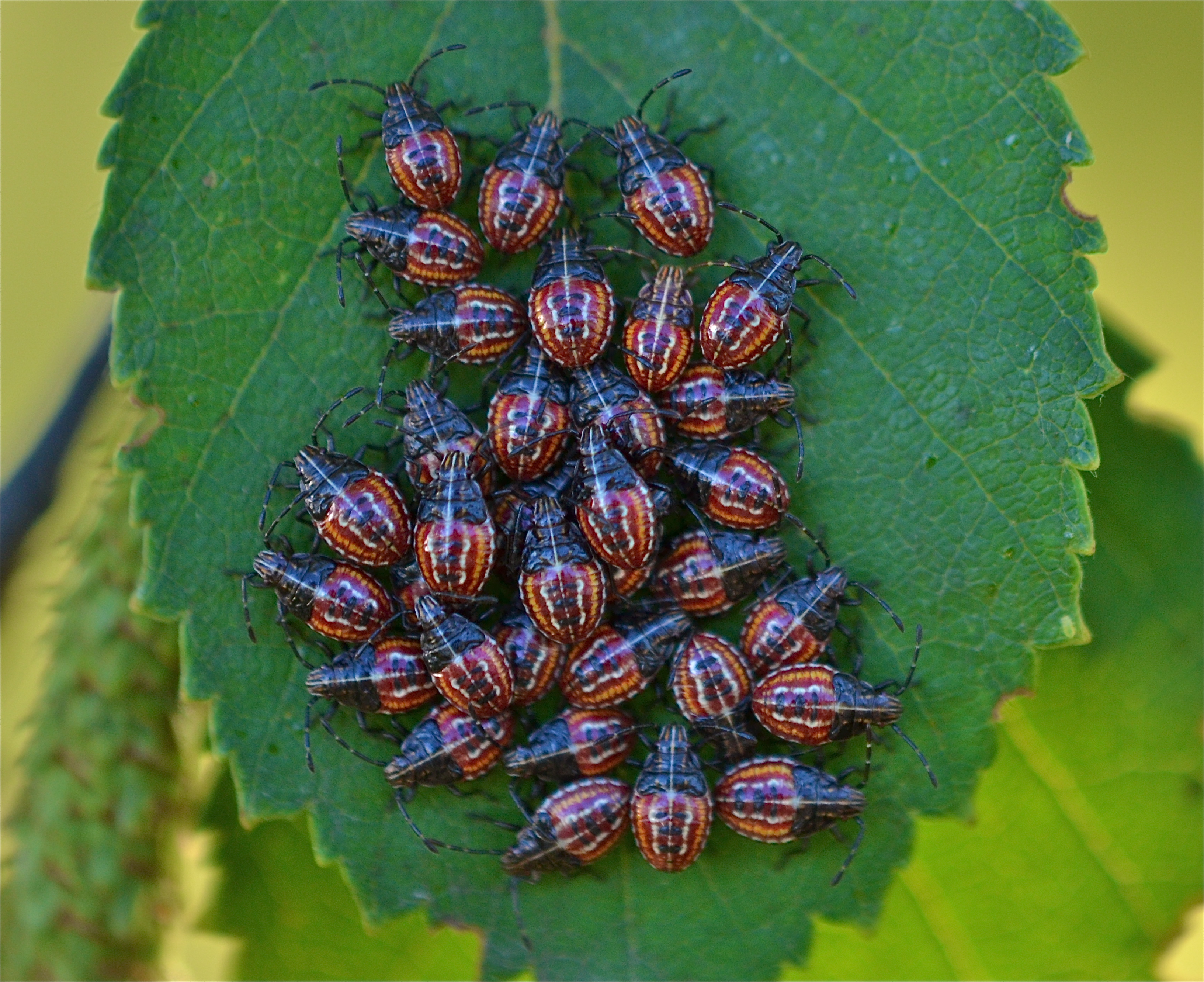 Elasmucha lateralis. Juvéniles. Classe des Insectes. Ordre de Hémiptères. Famille : Acanthosomatidae. Photographie prise 26/07/2013.