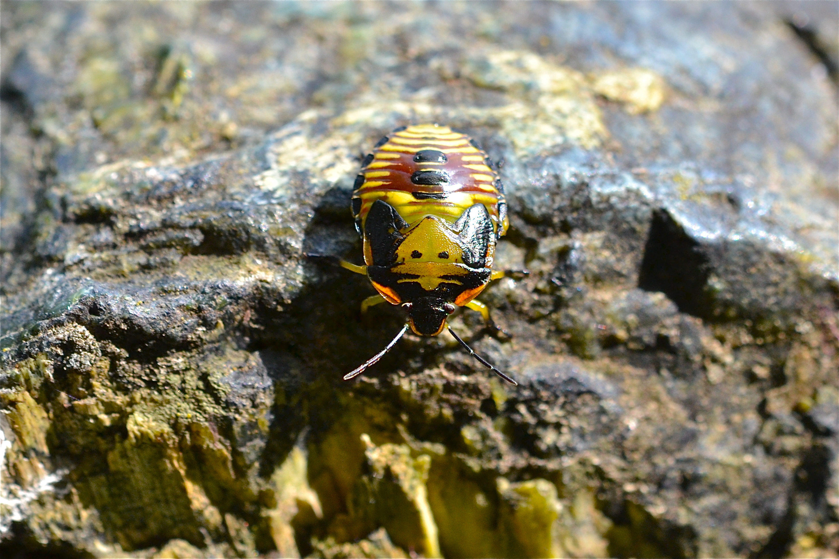Peut-être Acrosternum hilare. La Punaise verte. En anglais : Green stink bug. Juvénile. Vue de dessus. Classe des Insectes. Ordre des Hémiptères. Famille : Pentatomidae. Photographie prise le 30/08/2013.