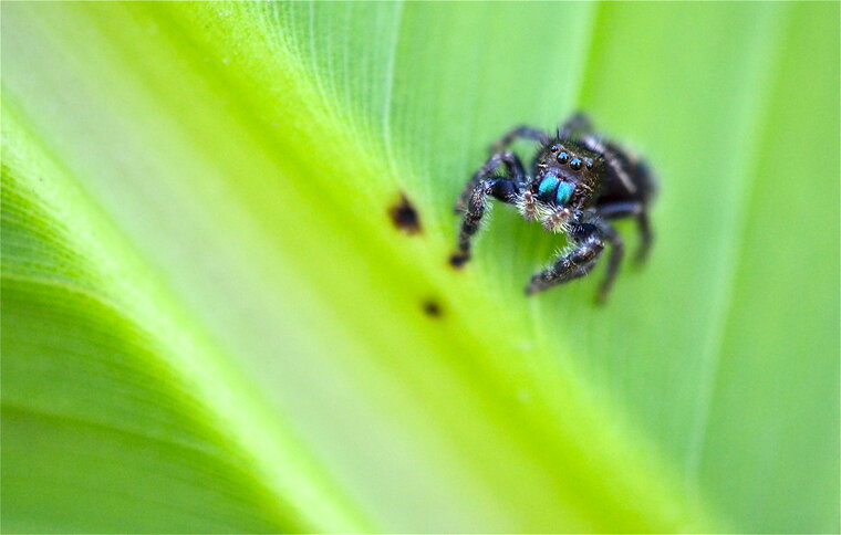 Phidippus audax. Vue de dessus. Classe des Arachnides. Ordre des Aranéides. Famille : Salticidae. Photographie prise le 12/10/2013.