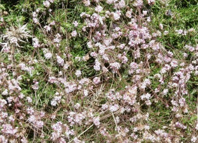 Les filaments roses sont des stolons sans feuilles, qui finissent par recouvrir la plante elle-même. On aperçoit les feuilles en dessous. En été, elle produit de minuscules fleurs et les stolons fanent et tombent. 5 à 10 cm de haut.