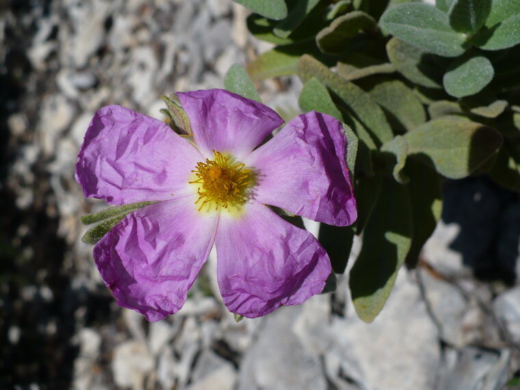 Les grandes fleurs (5-6cm de large) roses ou pourprées à coeur jaune, très décoratives mais très éphémères, s’épanouissent en corolle au sommet des rameaux. La corolle à 5 pétales fripés est doublée par un calice à 5 sépales 2 fois plus courts sur un pédoncule assez long.