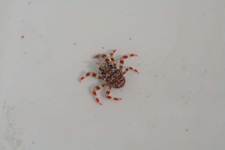 La galathée est un crustacé aplati, portant une paire de pinces. Elle peut se rencontrer sous les pierres à marée basse. La galathée striée se distingue notamment par des stries bleues qui constrastent avec une carapace rouge à l’âge adulte. Jeune specimen trouvé sur l’estran à Roscoff.