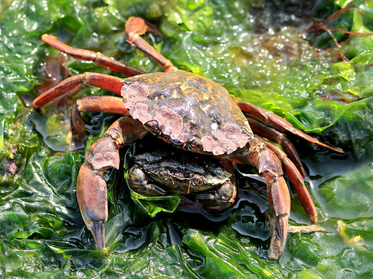 Accouplement de crabe vert. Le mâle, beaucoup plus grand, tient la femelle par une de ses pattes. Ils peuvent rester comme ça pendant plusieurs jours.