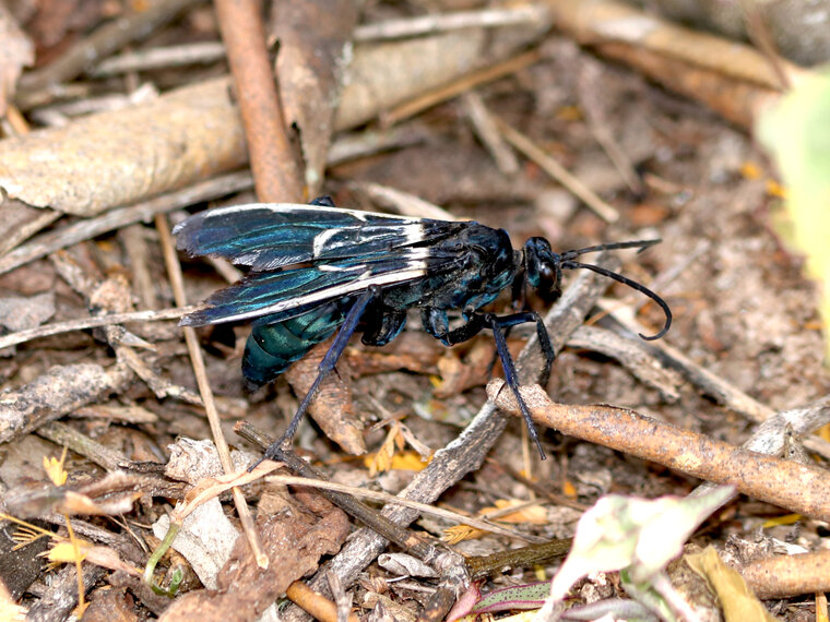 Grande guêpe noire de l’espèce Pepsis decorata. Cette guêpe est une véritable experte dans la chasse aux tarentules. Après avoir immobilisé sa proie avec son puissant venin, elle pond un œuf dans le corps de l’araignée et l’enfouit dans le sol. Après l’éclosion, la larve se nourrit du corps de l’araignée.