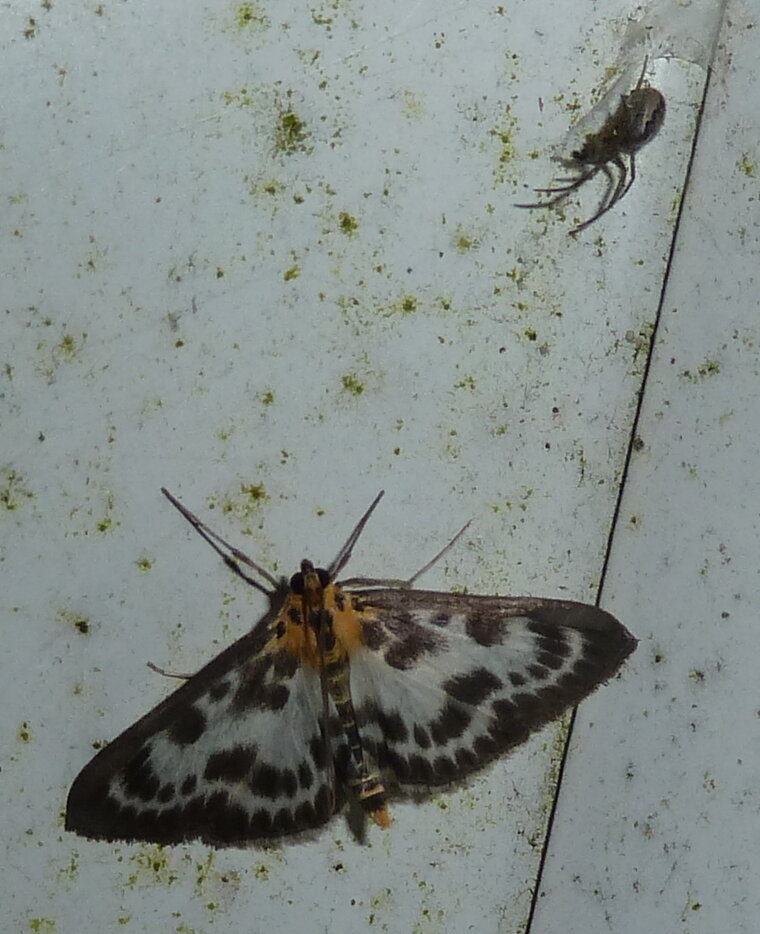 La pyrale de l’ortie se reconnaît aisément à ses ailes blanc et noir et à son corps noir et jaune. La chenille de ce « micro » familier vit sur l’ortie, d’où l’on débusque souvent les adultes durant la journée. Le papillon vole surtout en soirée et est attiré par la lumière. Fréquente tous les habitats où croît sa plante-hôte, surtout dans les parties humides des bois, des jardins et des friches. Période de vol : Mai à Août. (Nature en poche - Larousse)