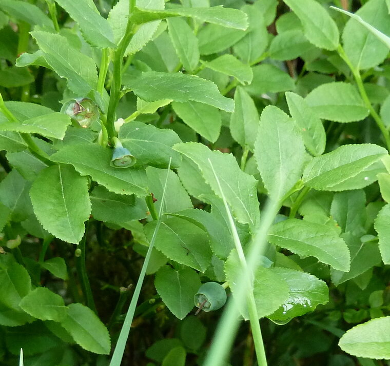 encore verte au mois de Mai. Les myrtilles sont des fruits produits par diverses espèces du genre Vaccinium (famille des Ericaceae). Ce sont de petites baies de couleur bleu-violacé à la saveur douce et légèrement sucrée.