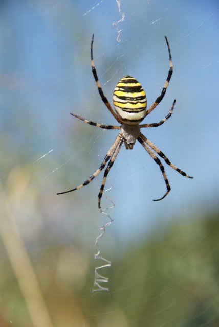 Voici une belle argiope fasciée (Argiope bruennichi) femelle (le mâle est rikiki) telle qu’on en voit de part nos garrigues...