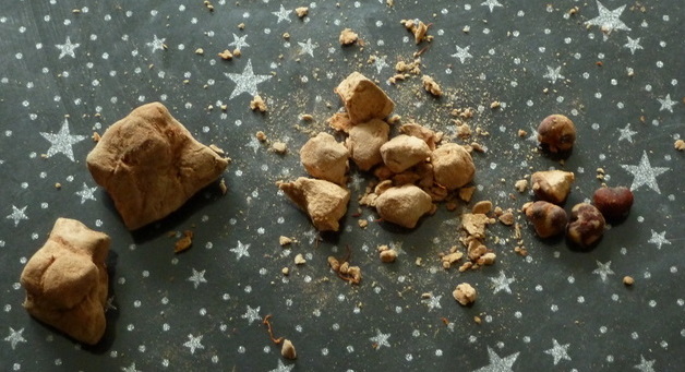 A l’interrieur, pleins de petits "blocs" friable, un peu comme de l’argile sèche et densuite une graine ressemblant étrangement a nos noisettes sèche.. Mais ceci n’est pas une référence car ce pain de singe est vieux. Il a été ramené d’Afrique en France il y a déja cinq voir six ans.