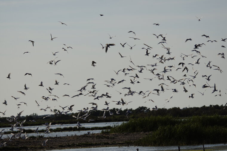 ici, les mouettes mélano’ la jouent collectif et créent un "bouclier" en s’envolant simultanément et empêcher le milan de plonger dans la colonie...